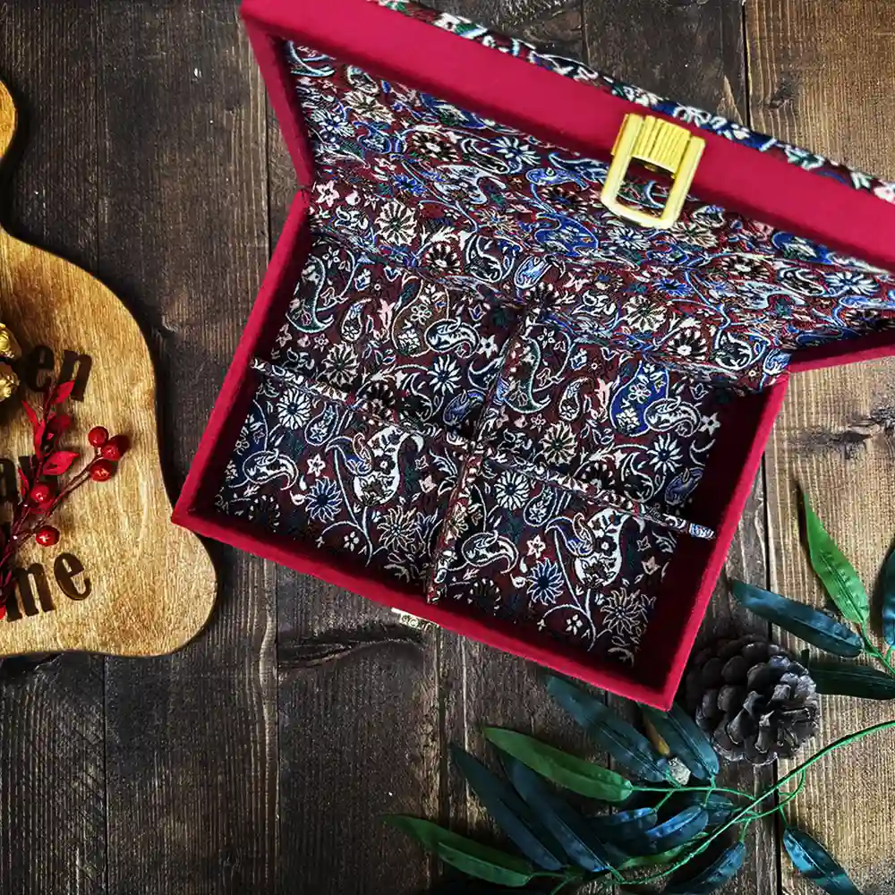 آنچه جعبه آرامیس را از سایر محصولات متمایز میکند، روکش چشمنواز پارچهی اصیل ترمه است. نقوش بته جقه ایرانی به رنگ سبز یک پسزمینهی اشرافی برای هر محصولی ایجاد میکنند و حسی از تجمل و هویت ایرانی را به مشتری منتقل مینمایند. این جعبه انتخابی بینظیر برای بستهبندیهای سازمانی، هدایای نوروزی، مناسبتهای خاص و یا محصولات لوکس شماست.